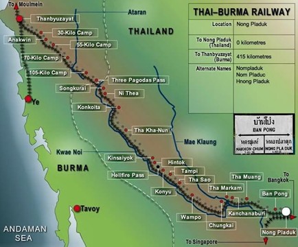 Construction commenced in November 1942 and ended in October 1943, at least 13,000 Australian POWs joined about 60,000 allied prisoners of the Japanese, and around 200,000 to 270,000 South-East Asian slave labourers, in the construction of the 412 kilometres of railway line. The line ran from Kanchanaburi in Thailand, to Thanbyuzayat in Burma. By the end, prisoners working on the rail route were calling it the Death Railway. Workers died at a rate of 20 men per day. It is said that a prisoner died for every sleeper on the railway. Australian senior officer, Brigadier Arthur Varley, himself a POW, said: “The Japanese will carry out their schedule and do not mind if the line is dotted with crosses.”